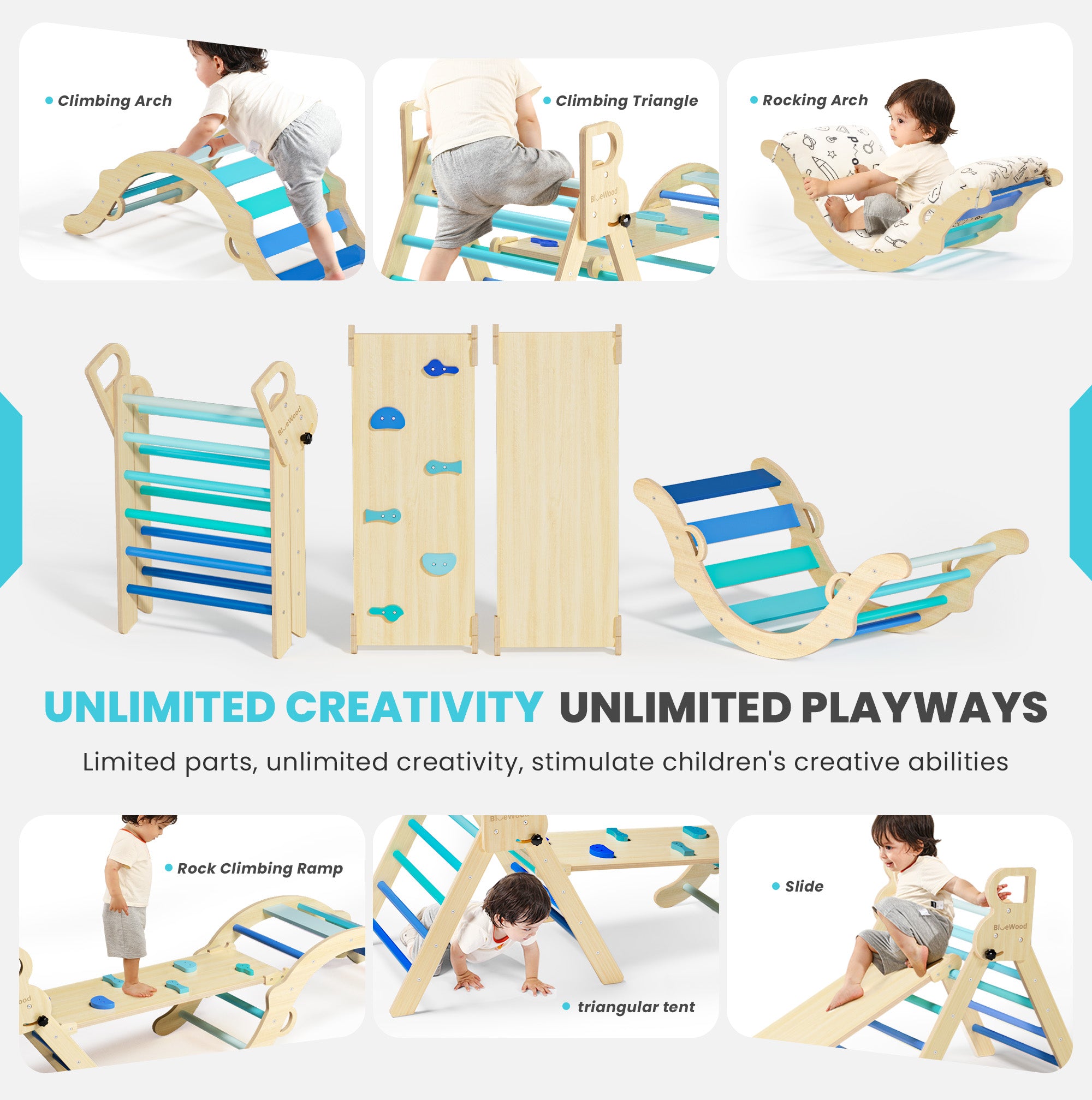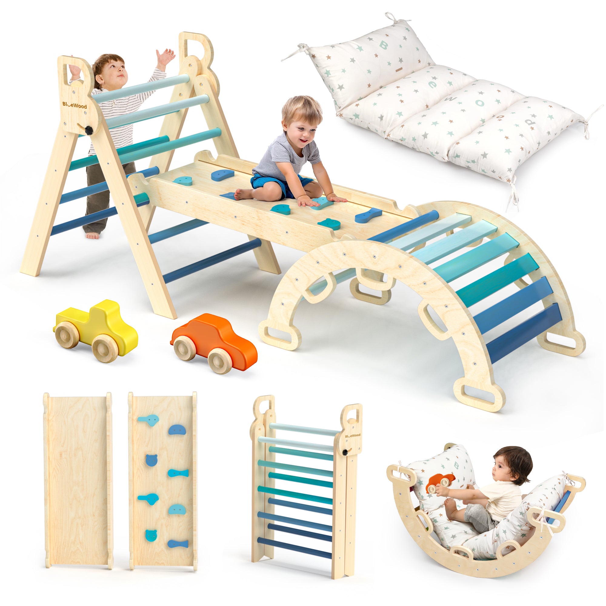 Totsicle- BlueWood® Pikler Triangle Playset with Cushion *Gradient Blue